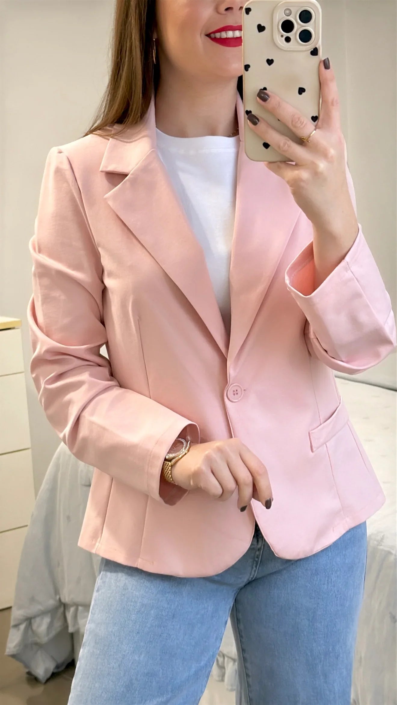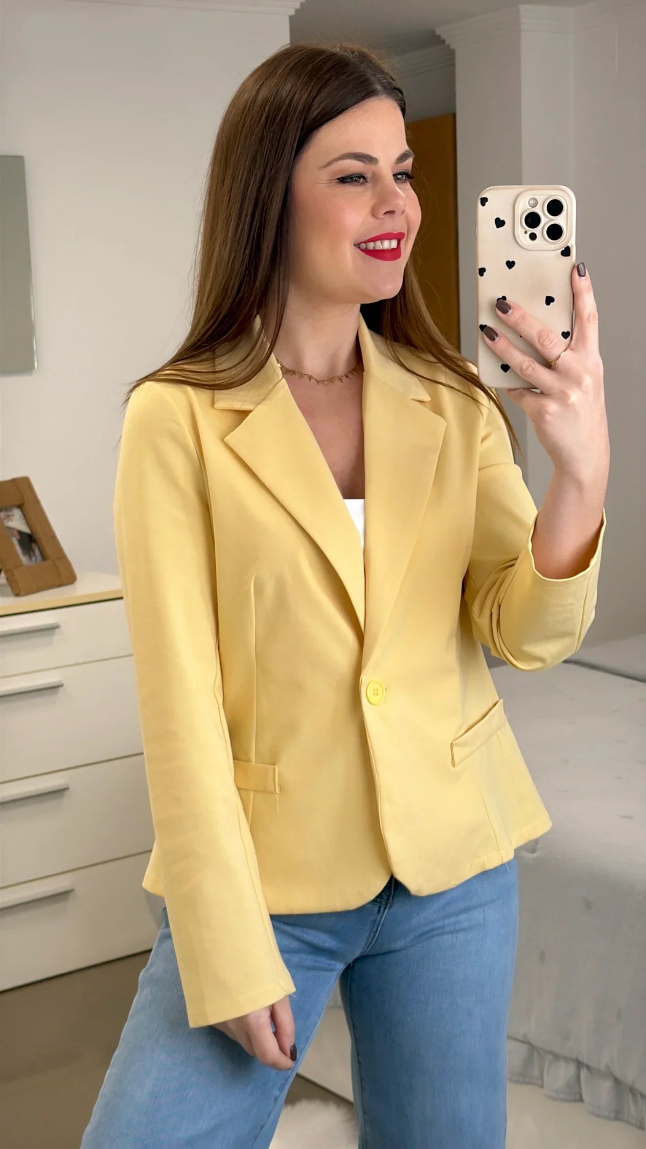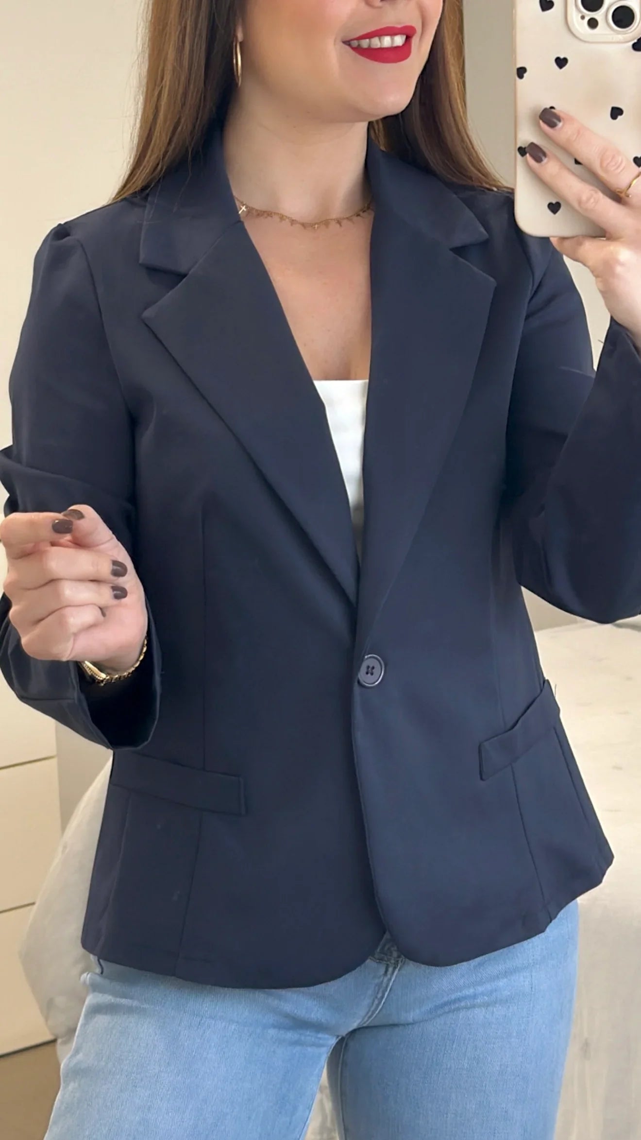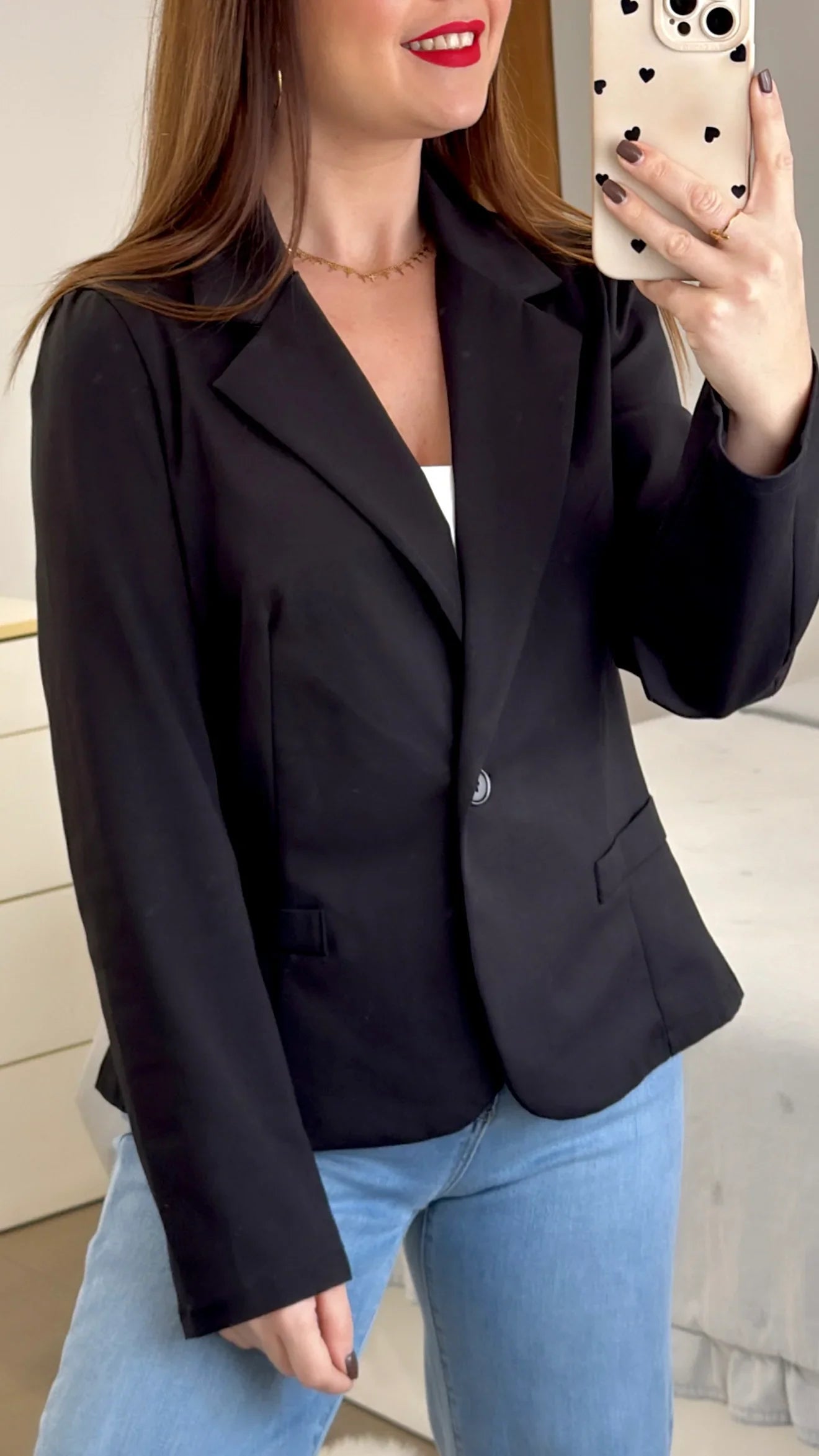 Esta Americana Básica de algodón ofrece una amplia variedad de tallas, desde la S hasta la XL, para adaptarse a diferentes cuerpos. Con un tejido de 53% algodón, 9% elastán y 38% nylon, garantiza comodidad y durabilidad. El cuello solapado le da un toque elegante y versátil.
