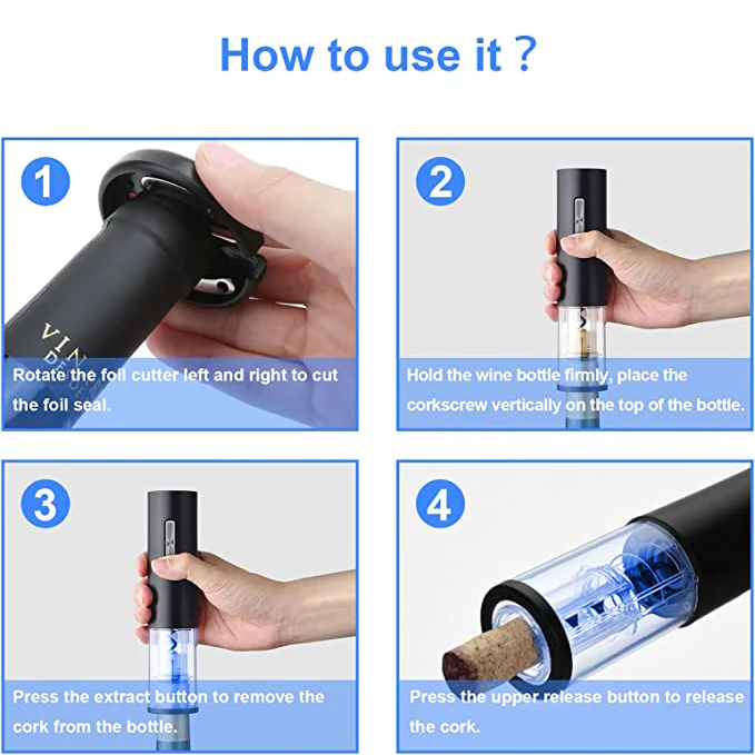 🍷 Easily Remove The Core Wire - Rotate the foil cutting machine left and right to cut the foil seal. Hold the bottle firmly, place the bottle opener vertically at the top of the bottle, and then press the "down" button to remove the cork. Finally, press the "up" button to eject the cork from the bottle opener.