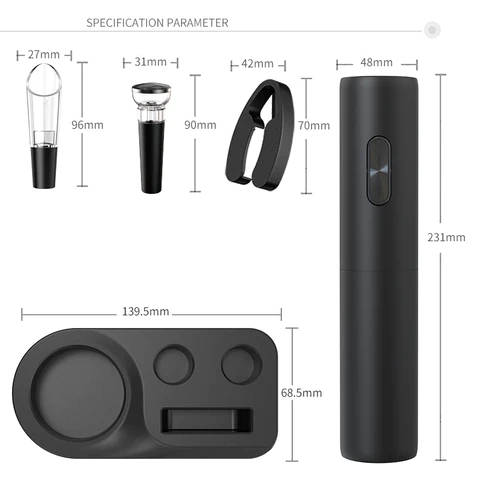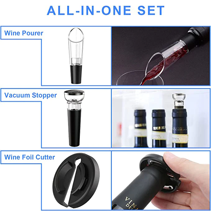 🍷 Extraordinary Design -The electric bottle opener is made of stainless steel to ensure long-term safe use. A 5-piece base style wine set, with one set for opening, pouring, and storing to meet the needs of wine tasting.