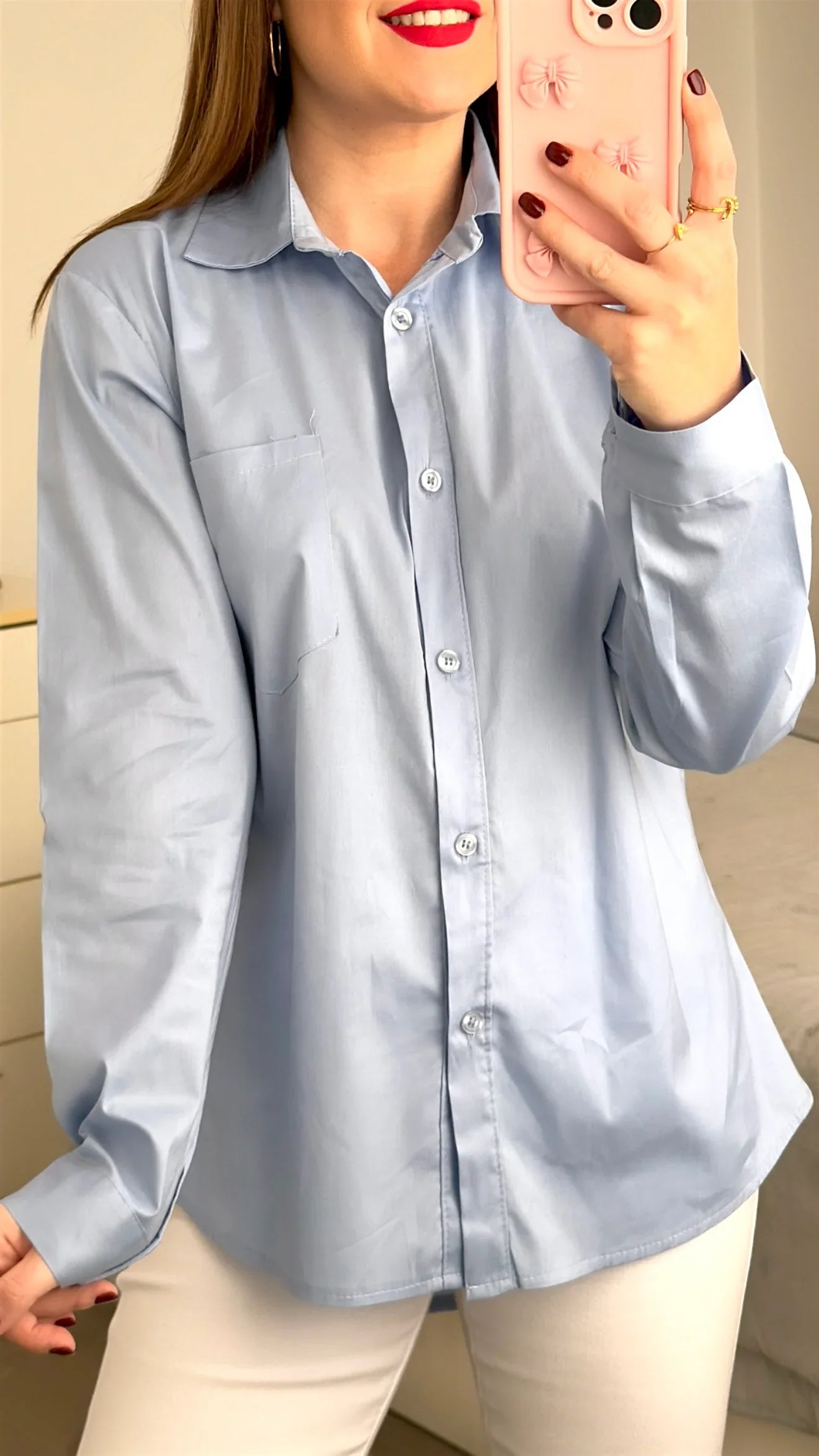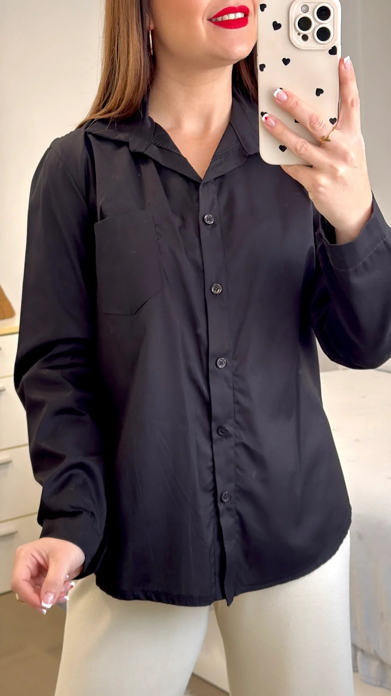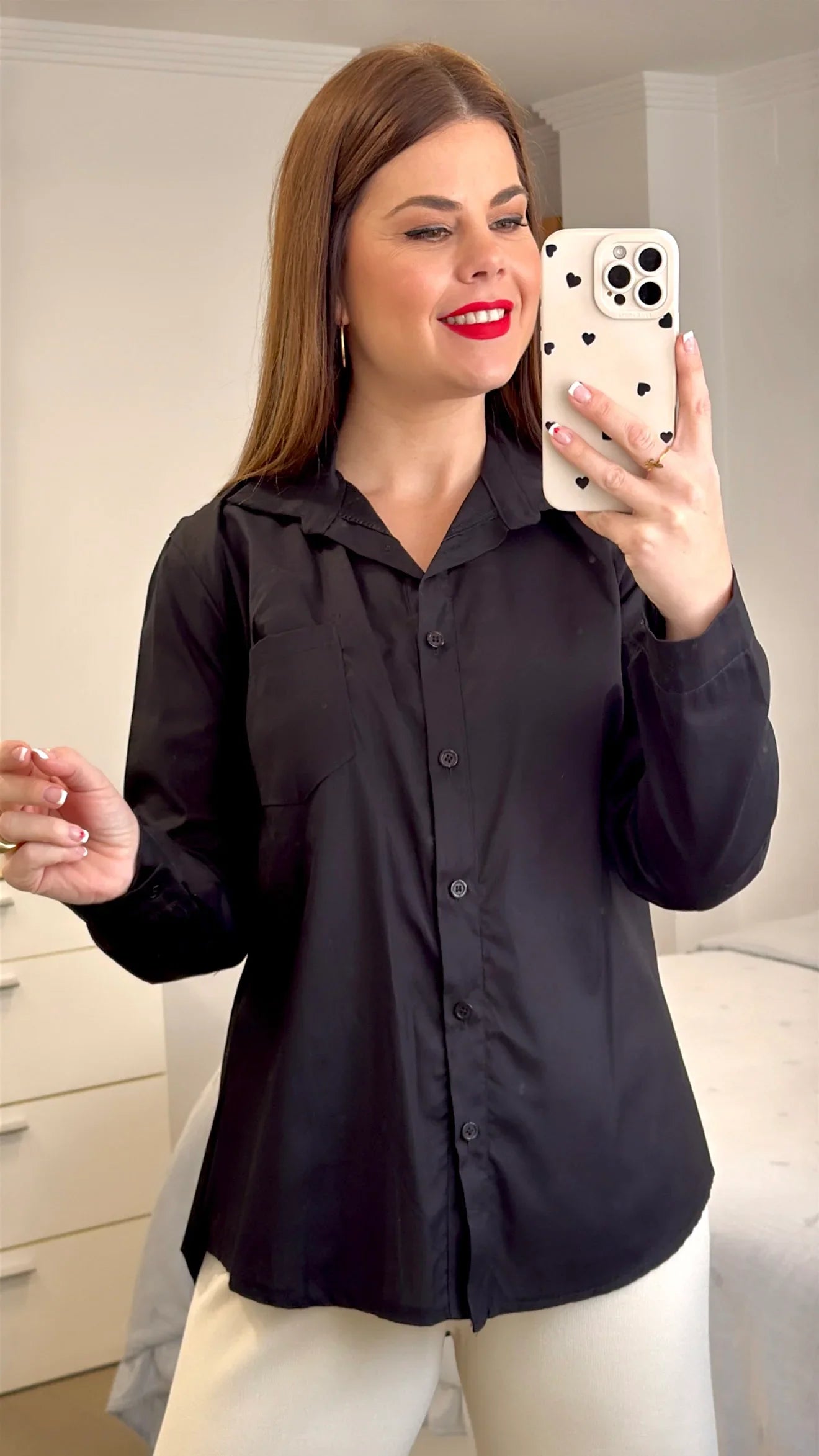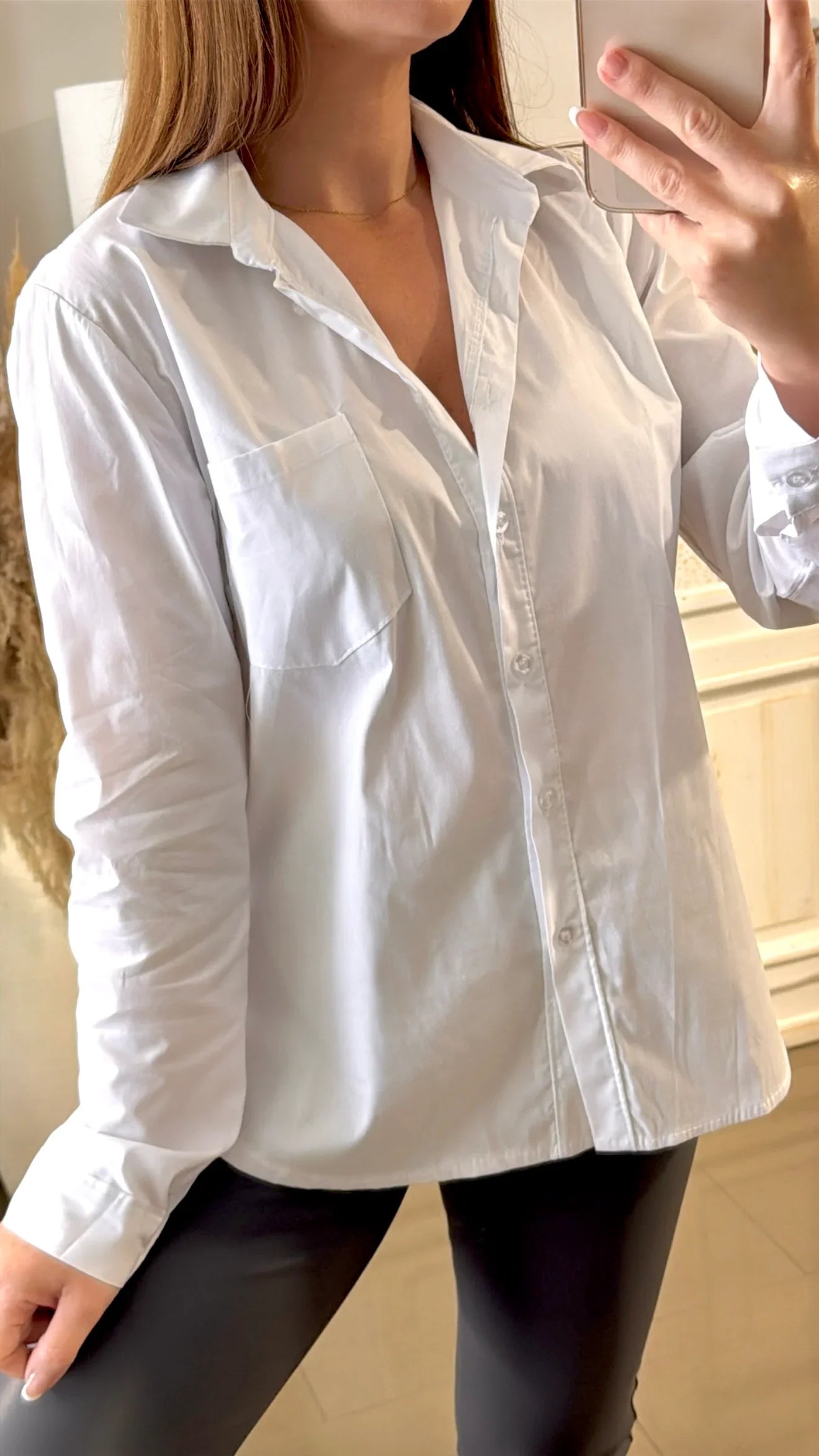Disponible en talla única, cuello solapado. Abotonada en la parte frontal. Compuesta por 95% algodón y 5% elastan.