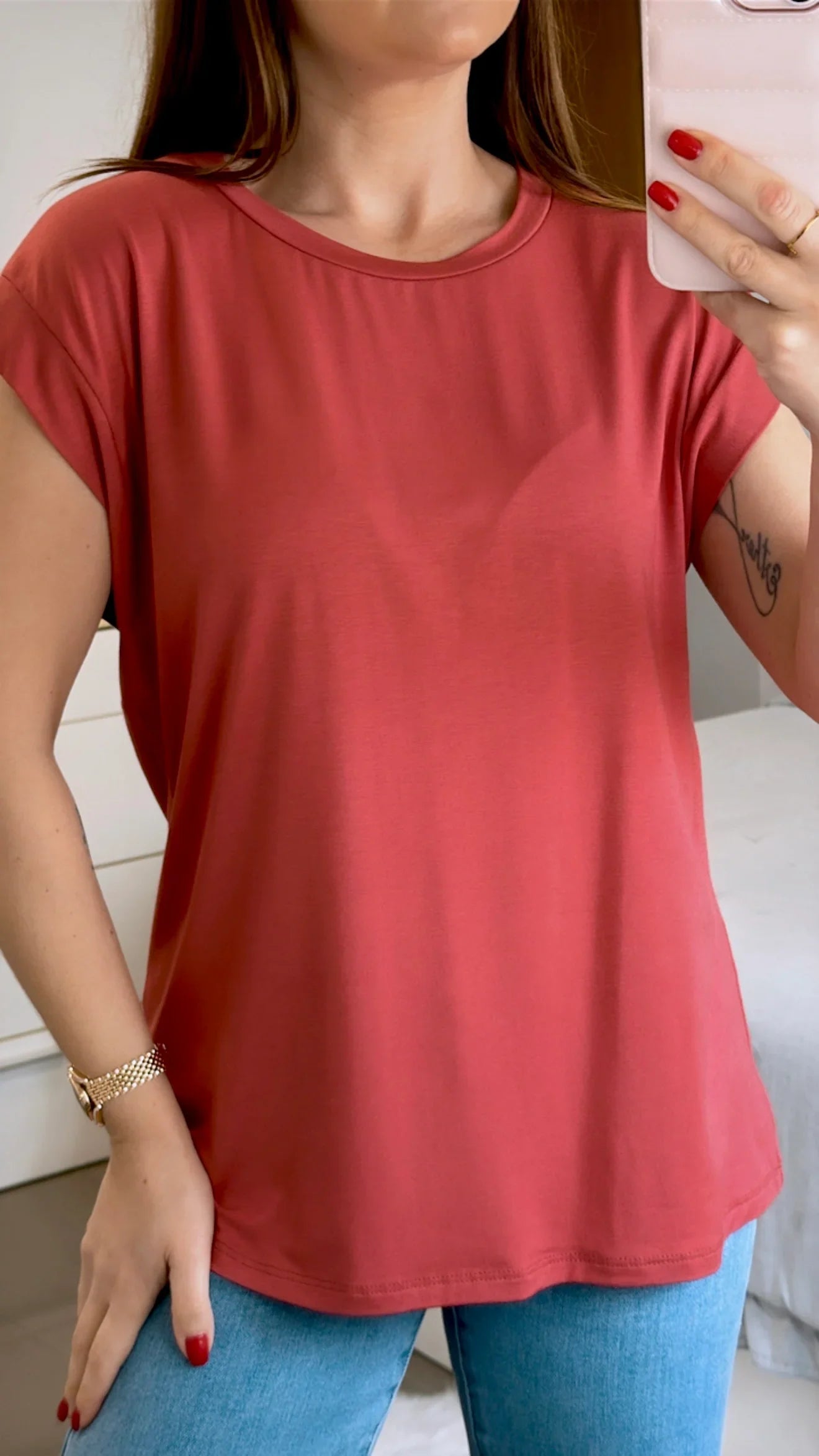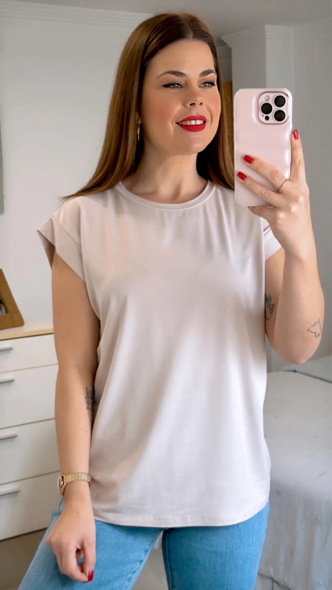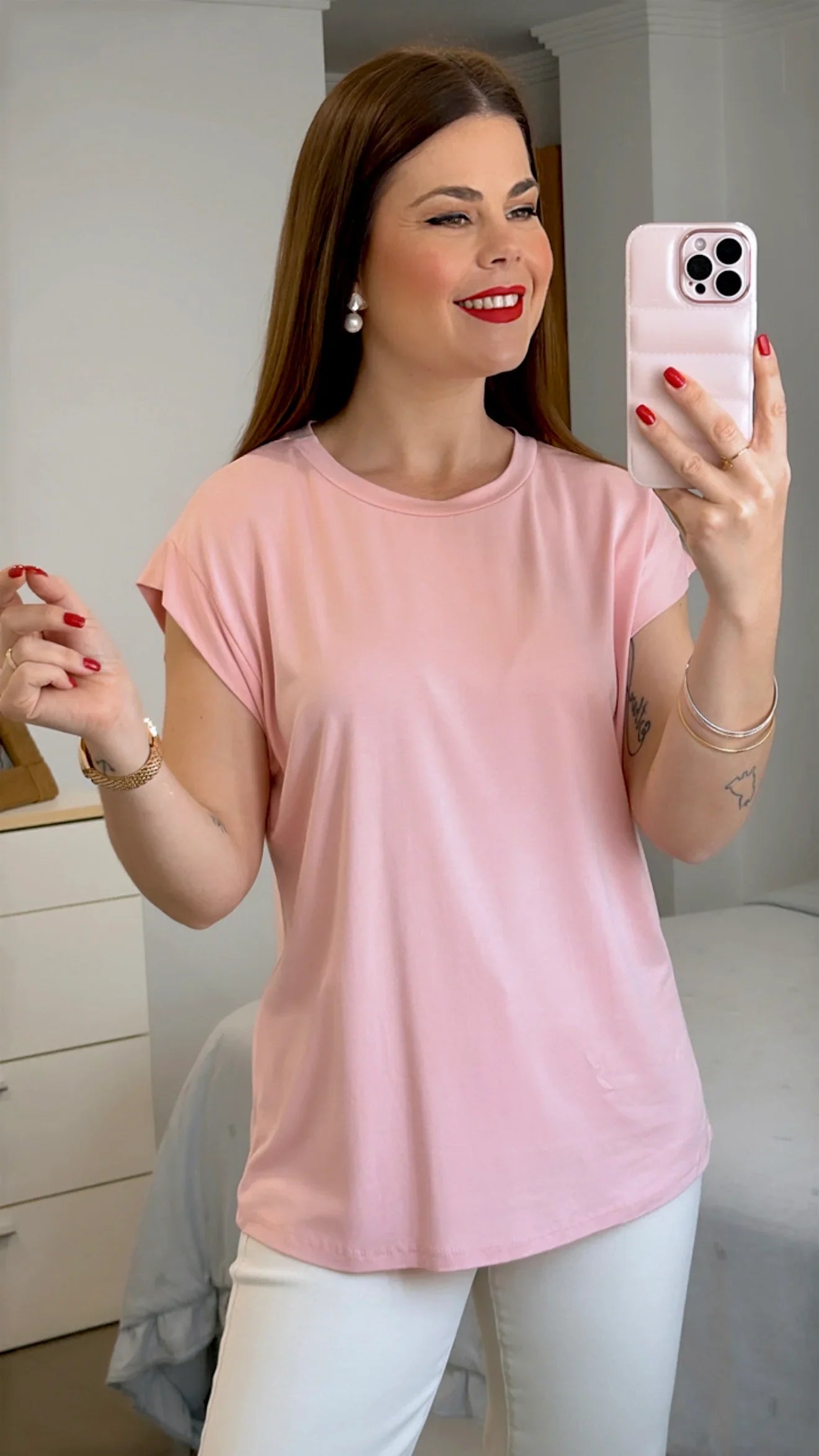 Presentamos CAMISETA CAMI, una camiseta básica de manga corta tipo oversize. Está hecha de una combinación de 95% viscosa y 5% elastano para un vestir cómodo y con movimiento entre tus actividades diarias. Disponible en talla única, recomendamos consultar las medidas para garantizar un ajuste perfecto.